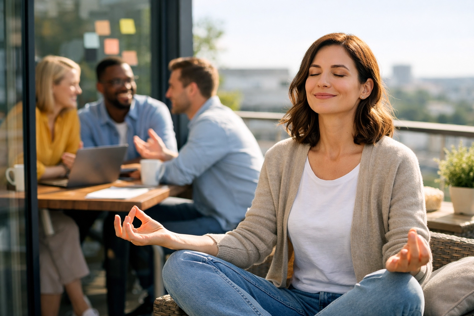 A peaceful leader practicing JOMO and mindful leadership in a bright, modern office setting.